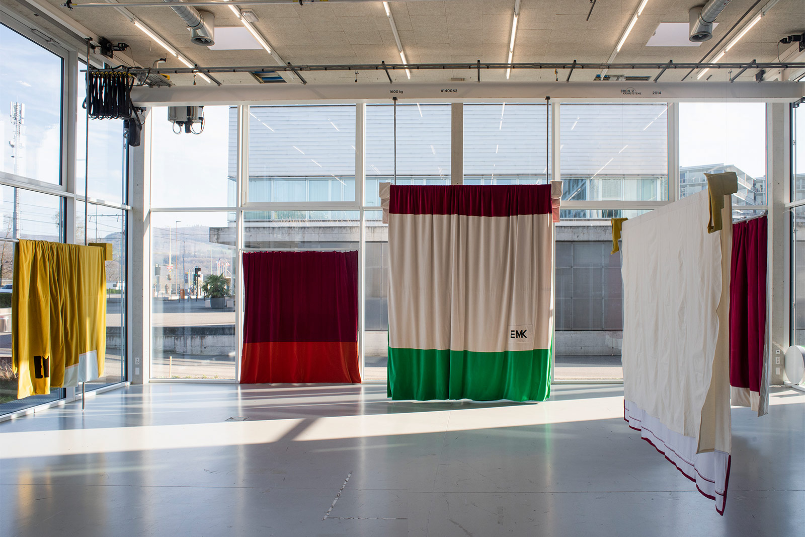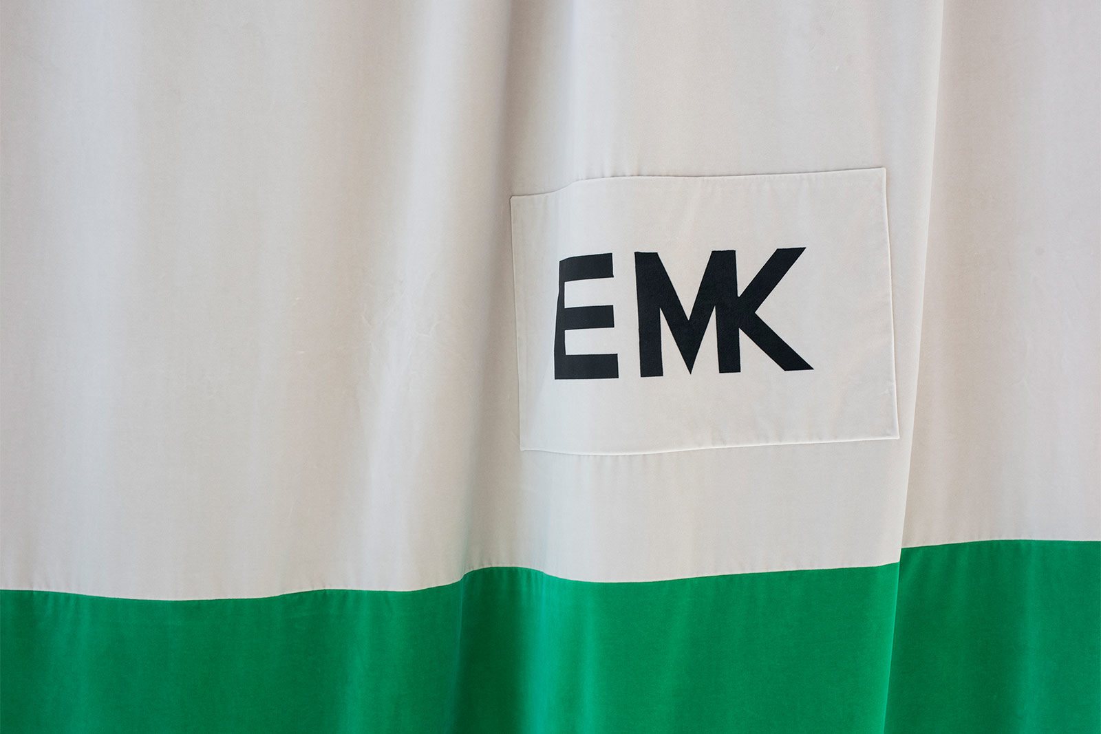 With VORHANG (curtain) at der TANK, Emil Michael Klein presents for the first time a selection of his textile works in an installation-like setting. The Curtains were created over the past ten years for exhibitions of his paintings or for special occasions such as the exhibition Stop Painting at the Fondazione Prada in Venice in 2021, curated by Peter Fischli. This exhibition focused on the eventful history of painting since the late 19th century. A look at art history shows that artists have repeatedly reconfigured both the concept of the image itself and their own painting practice, aligning them with the discourses and sensibilities of their respective eras. Historically, Emil Michael Klein’s work can be situated in the context of non-figurative post-painterly abstraction. Curtains form a separate field of work within his paintings and embody an expanded, transmedial concept of the artwork. Central to these works is the depiction and multifaceted exploration of the artist’s signature, which in his textile pieces assumes the role of the figure and emerges as a logo.